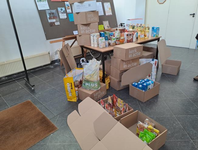 Kerk in actie heeft een landelijke actie georganiseerd waarbij gemeenten werden opgeroepen om voedsel voor de voedselbank in te zamelen. Tijdens de dienst op zondag 7 januari werd er tijdens de afkondigingen verzocht om houdbare etenswaren voor de voedselbank te Winsum in te gaan zamelen. Er waren lijstjes met de gewenste etenswaren. Het was ook mogelijk om een doos mee te nemen en die dan geheel of gedeeltelijk te vullen. De actie duurde maar 1 week. De verrassing was dan ook groot dat de Diaconie vierentwintig dozen met etenswaren kon vullen. Op de foto is de tafel de dozen en tassen te zien met daarop de ingebrachte levensmiddelen. Via deze weg willen we een ieder die een bijdrage heeft gedaan, hartelijk danken.