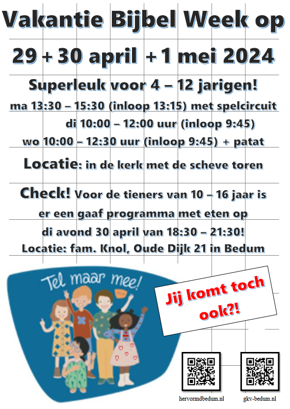 Heeft u/heb jij zin om je steentje bij te dragen aan deze Vakantie Bijbel Week geef dit dan door bij o.a. onderstaande personen. Vele handen maken licht werk!